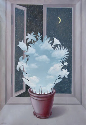 This painting with flowers on the window breathes metaphysics and the night lays a soul silence over the simple and static composition.
